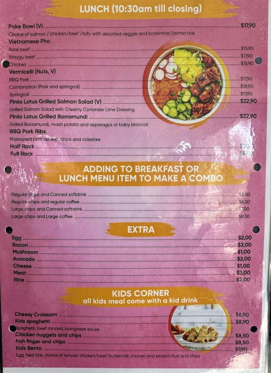 Desserts are not to be missed either, featuring tempting options like the Grilled Banana Waffle and Ice Cream Bowl, perfect for satisfying your sweet tooth. Many visitors, including families, have praised the cafe's friendly staff and inviting atmosphere, making it an excellent choice for a meal out. Come experience the delightful offerings of Pinks Lotus Cafe—a true gem among local cafes!